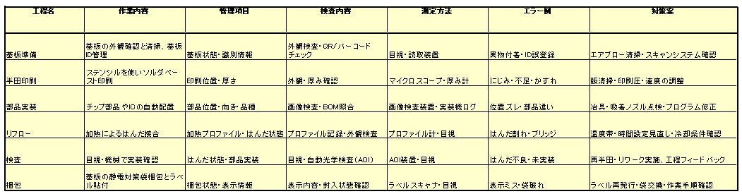 各工程に対して「作業内容/管理項目/検査内容/測定方法/エラー例/対策案」を記載してください。対象製品:電子制御基板