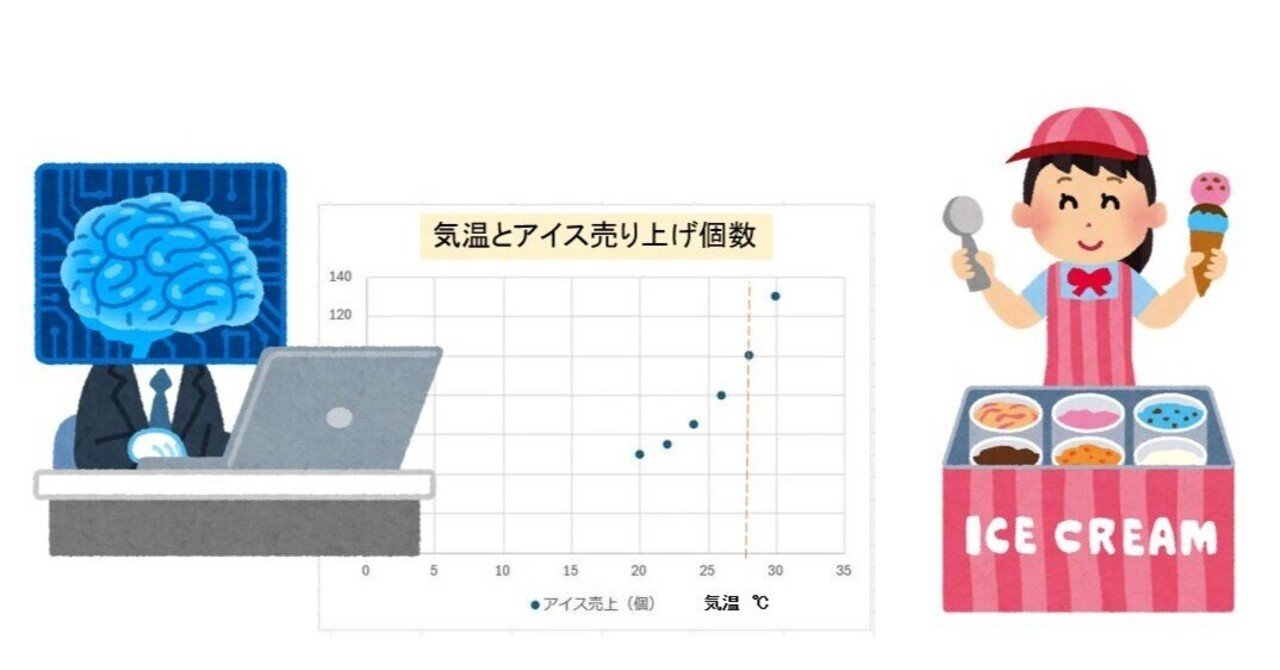 気温とアイス売上の相関関係をAIでグラフ化した結果、28℃を超えると売上が急増する傾向が明確に。