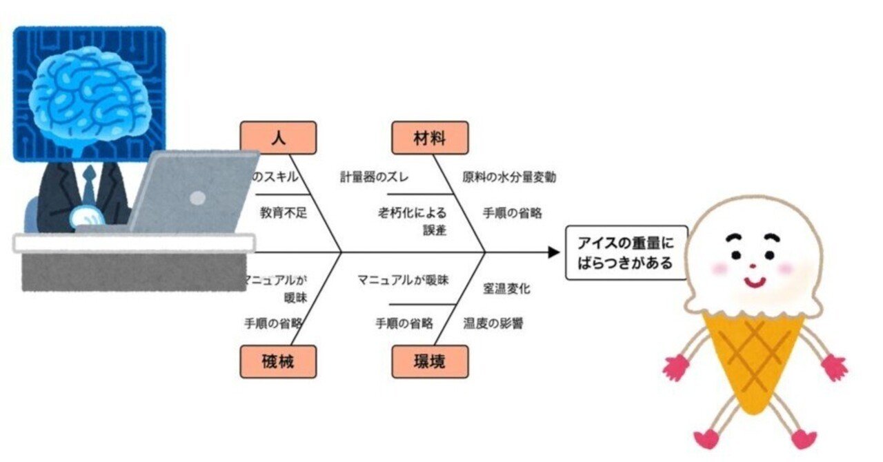 「アイスの重量にばらつきがある」問題について、「人」「機械」「材料」「方法」「環境」の5つの観点で、特性要因図の要素を挙げてください。