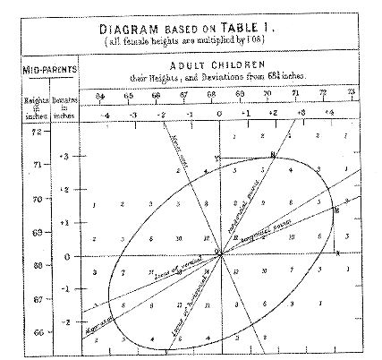 回帰直線を始めて示したのは,イギリスの統計学者のゴルトン(Sir Francis Galton, 1822-1911)である。ゴルトンは多数の「親子の身長」を調べた結果、