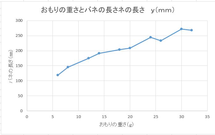 図は,このデータの散布図である。この図から,おもりの重さxとバネの長さyの関係として,直線の式