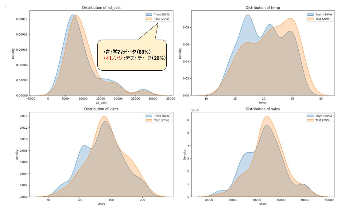「学習データ80% vs テストデータ20%」の分布比較可視化の図は下記です。